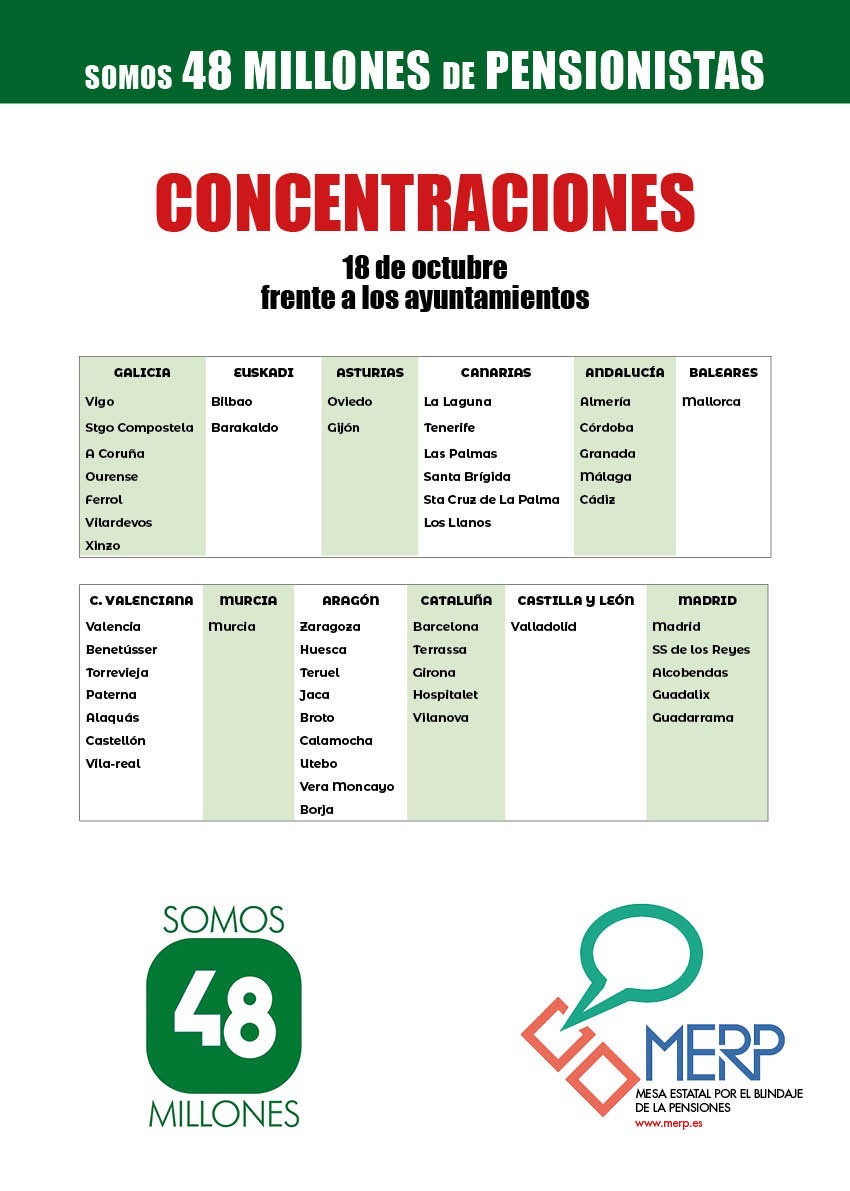 “Somos 48 millones de pensionistas”, el lema de la Mesa Estatal por el Blindaje de las Pensiones (MERP) sale nuevamente a las calles en 50 poblaciones de todo el país, mañana, 18 de octubre, a las 12:00 horas, para reivindicar la necesidad de blindar las pensiones en la Constitución y defender el sistema público de pensiones.