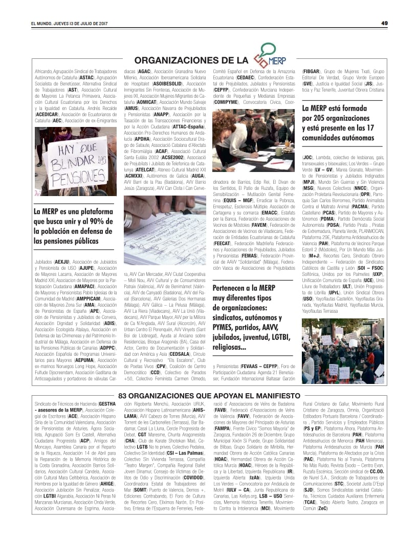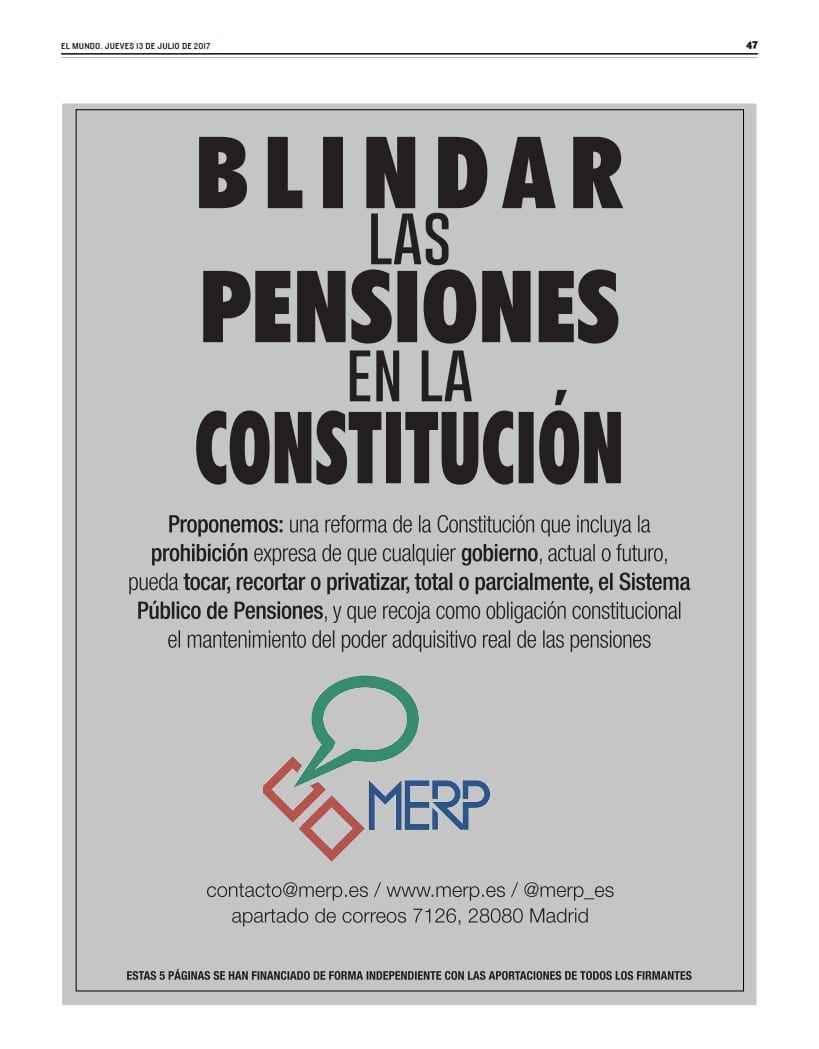 La MERP (Mesa Estatal Pro-Referéndum de las Pensiones) lanza el manifiesto ‘Blindar Las Pensiones en la Constitución’, con el respaldo de 300 organizaciones y 80 personalidades y que ha sido publicado hoy en El Mundo.