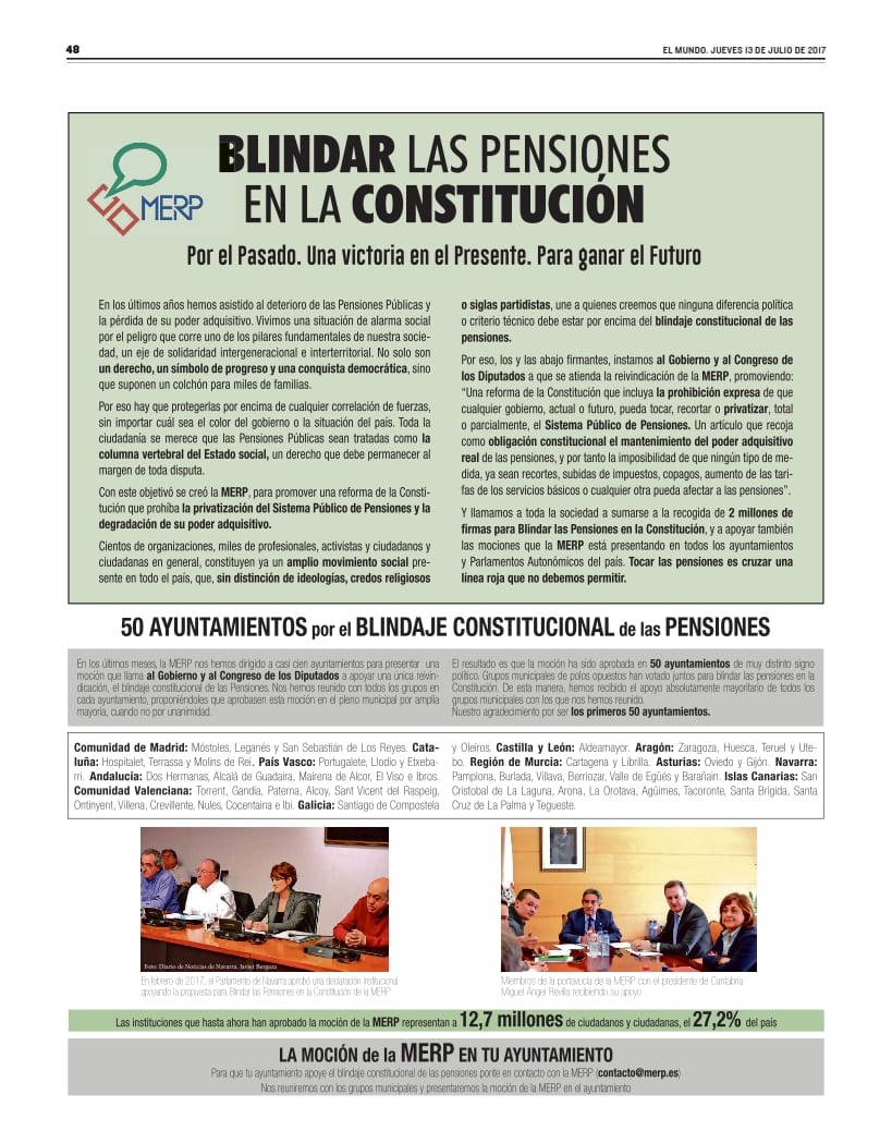 50 ayuntamientos apoyan ya la moción de la MERP por el blindaje constitucional de las pensiones, como el de Santiago de Compostela, Oviedo, Pamplona o Zaragoza, y el del Parlamento de Cantabria. Según se explica en las 5 páginas a lo largo de las que se extiende el contenido de la campaña, las instituciones que han aprobado ya la moción de la MERP representan a 12,7 millones de ciudadanos, que supone el 27% de la población.