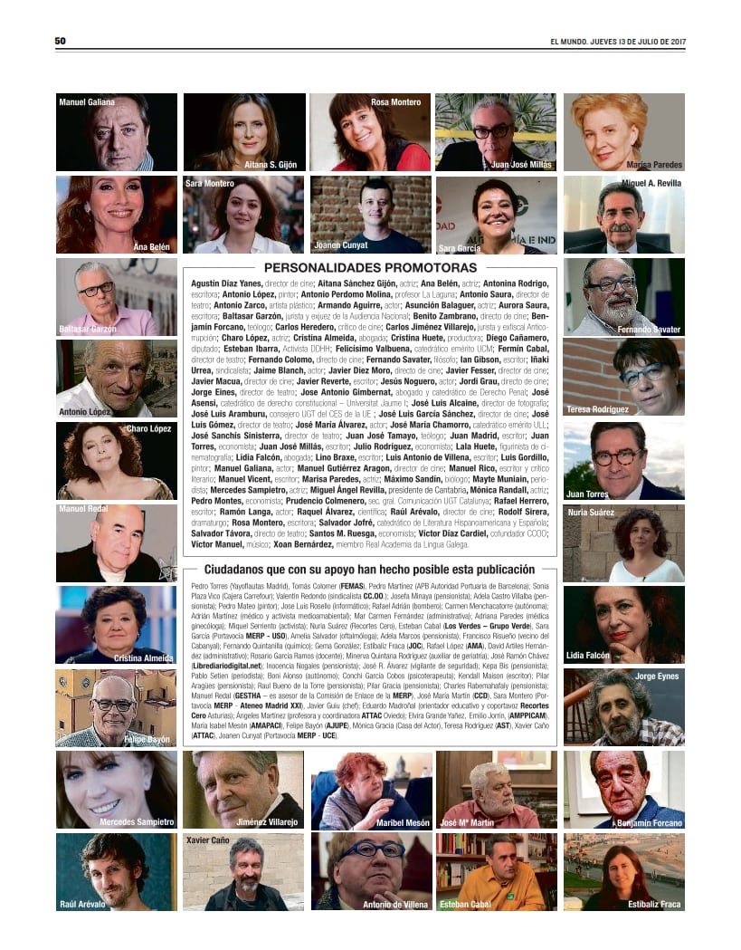 Entre las personalidades están el presidente de Cantabria, Miguel Ángel Revilla, los escritores Juan José Millás y Rosa Montero, las actrices Aitana Sáchez Gijón, Ana Belén y Charo López, y el actor y director de cine Raúl Arévalo.