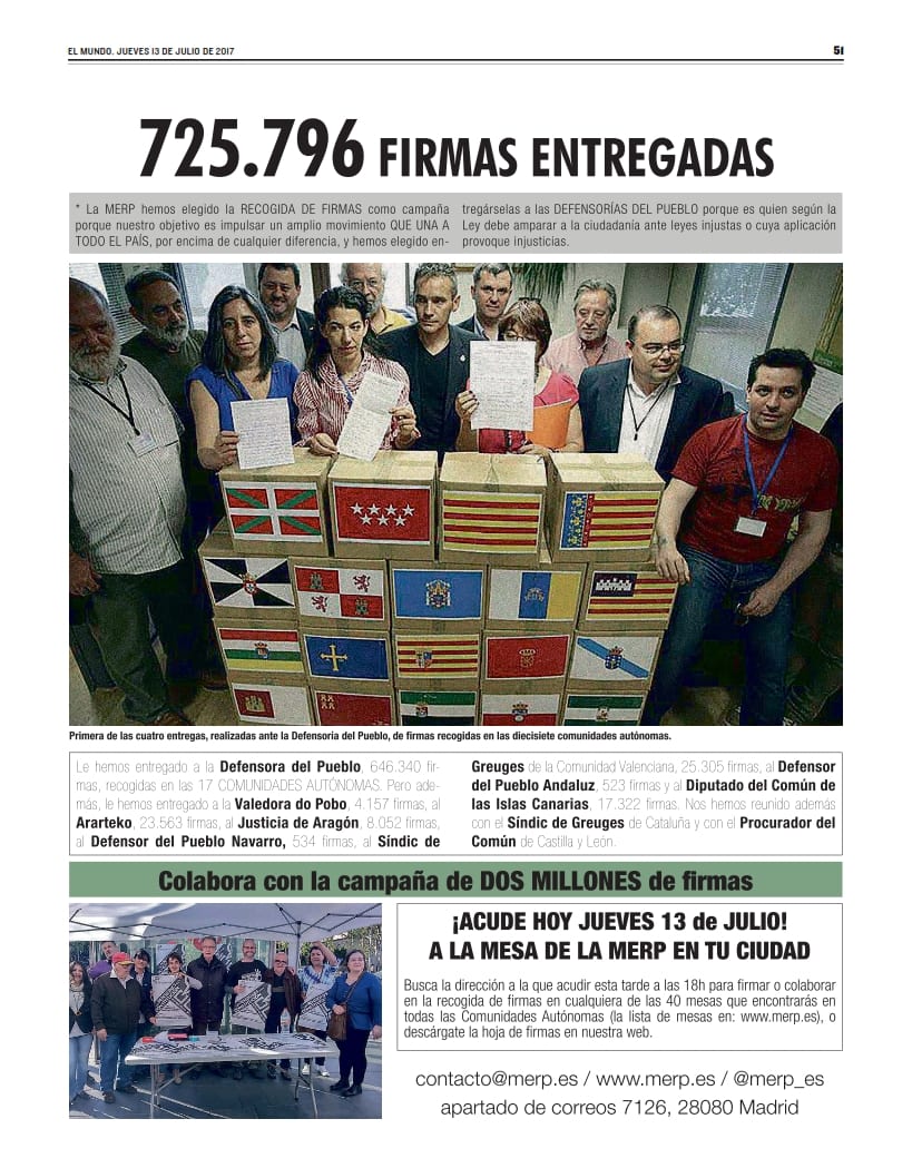 La MERP ha entregado ya casi 800 mil firmas ante las defensorías del pueblo, y con este manifiesto lanza la campaña para llegar a los dos millones.