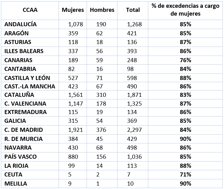 La feminización de las excedencias de cuidados es generalizada en España. Ceuta (71 %) y Canarias (76 %) son las regiones con menores porcentajes de feminización en esta materia. Las que tienen un porcentaje más alto son: Murcia (90 %) y Melilla (90 %). A continuación, presentamos los datos de todas las Comunidades y Ciudades Autónomas.