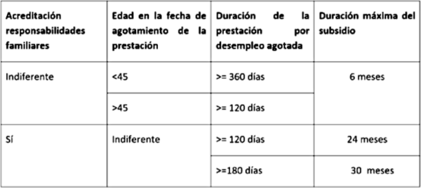 Las personas en situación legal de desempleo que no tengan cubierto el periodo mínimo de cotización para tener derecho a la prestación contributiva deben haber cotizado al menos 3 meses. Para las que hayan cotizado cuatro, cinco o seis meses sin cargas familiares, la duración del subsidio será igual. Y, si han cotizado 6 meses, pero tienen cargas familiares, la duración del subsidio será de 21 meses.