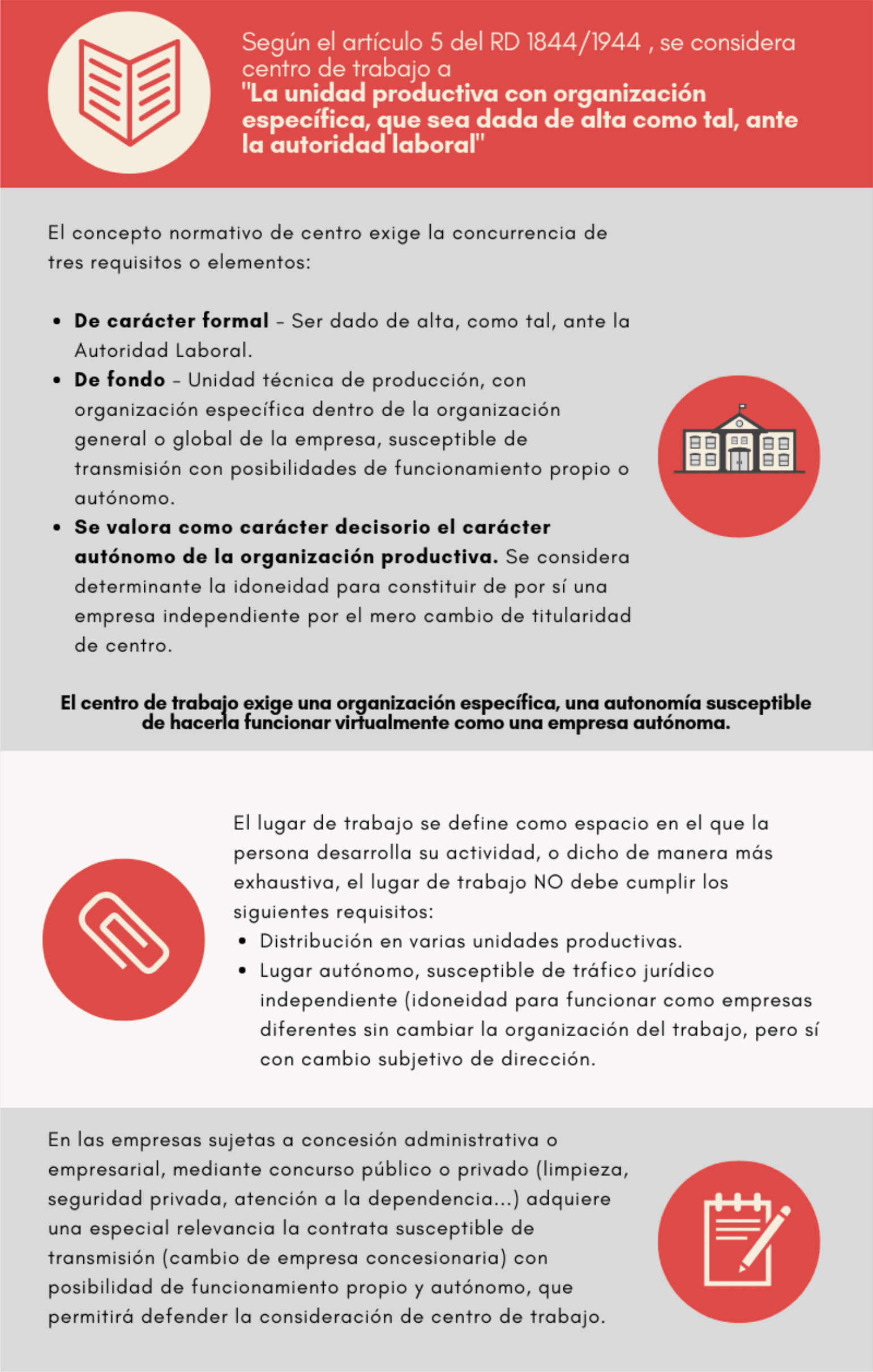 La unidad electoral por excelencia es el centro de trabajo. Sin embargo, la normativa no fija unos criterios claros bajo los que delimitar este concepto, lo que ocasiona innumerables problemas de seguridad jurídica y de impugnación de procesos electorales.