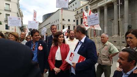 Durante la concentración, Isabel Díaz Ayuso, candidata del PP a la Comunidad de Madrid, y Juan Carlos Girauta y Marta Rivera de Ciudadanos han mostrado su apoyo a las reivindicaciones de FEUSO.