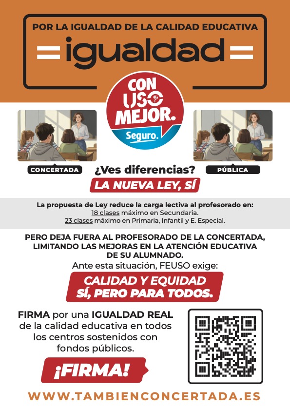 FEUSO ha puesto en marcha la campaña IGUALDAD, una iniciativa para reclamar que la reducción de la jornada lectiva del profesorado propuesta por el Gobierno se aplique también a los trabajadores de la enseñanza concertada.