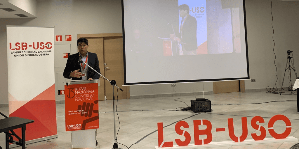 “En estos días, de hecho, muchos de los que estáis aquí os habéis multiplicado para atender tanto a la organización de este congreso tan emotivo como a las constantes movilizaciones. Es un orgullo haber visto las banderas de LSB-USO en las movilizaciones del metal, a pesar del juego sucio que aquí tenéis por partida doble. Pero seguimos en la lucha con nuestros afiliados del sector, y encabezando las protestas en Álava. La USO estará donde nuestros afiliados nos pidan, no donde otros quieran o no quieran que estemos”, animó a los delegados del metal y del comercio, en plena protesta por sus convenios.