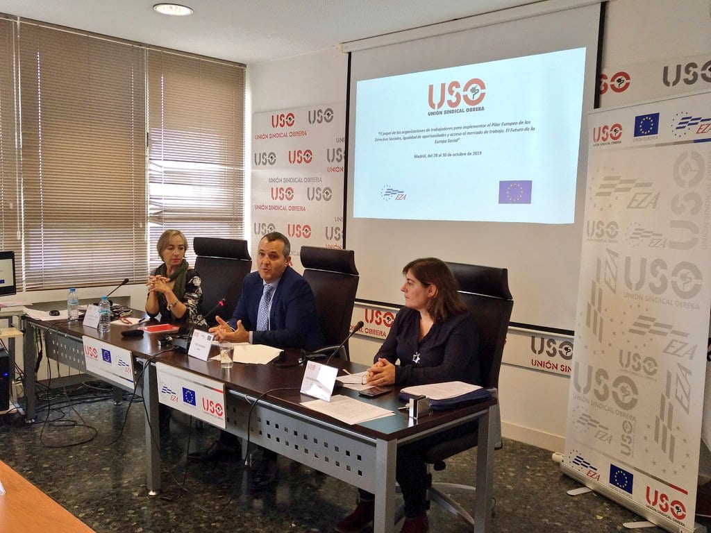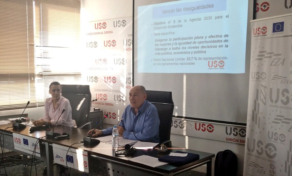 El secretario general de USO, Joaquín Pérez, junto con la secretaria de Igualdad, Dulce Moreno, y el responsable de Juventud USO, Pablo Trapero cerraron las ponencias de este seminario de formación internacional de EZA. Pérez se mostró satisfecho por la activa participación durante estos dos días de formación y debate, convencido de que “el trabajo conjunto de sindicatos y organizaciones sociales contribuirá a continuar el camino para que la igualdad entre hombres y mujeres para acceder al empleo sea una verdadera realidad en unos años”.