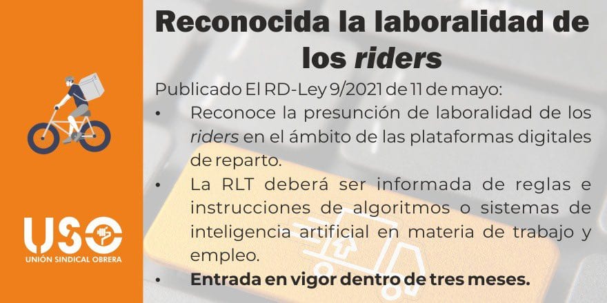 ¿Qué significa esto para los repartidores? ¿Cómo cambia su situación a partir de hoy? USO explica las consecuencias de esta nueva Ley.