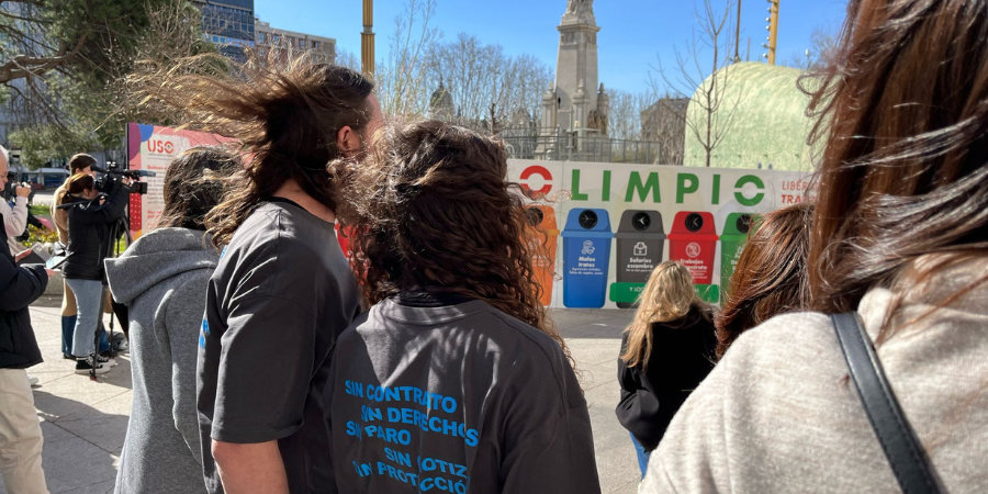 Escenificar los contratos de mierda y los contratos basura era el fin del acto organizado hoy por Juventud-USO. Las horas extras sin cobrar, al contenedor amarillo; los salarios escombro, en el negro; si has trabajado gratis o sin contrato, recíclalo en el contenedor rojo; los despidos injustos van al verde. Así, USO ha instalado un punto limpio de condiciones laborales basura en la plaza de España, en Madrid, al que jóvenes de toda España se han acercado a deshacerse de todos los abusos que han sufrido en sus trabajos de mierda.