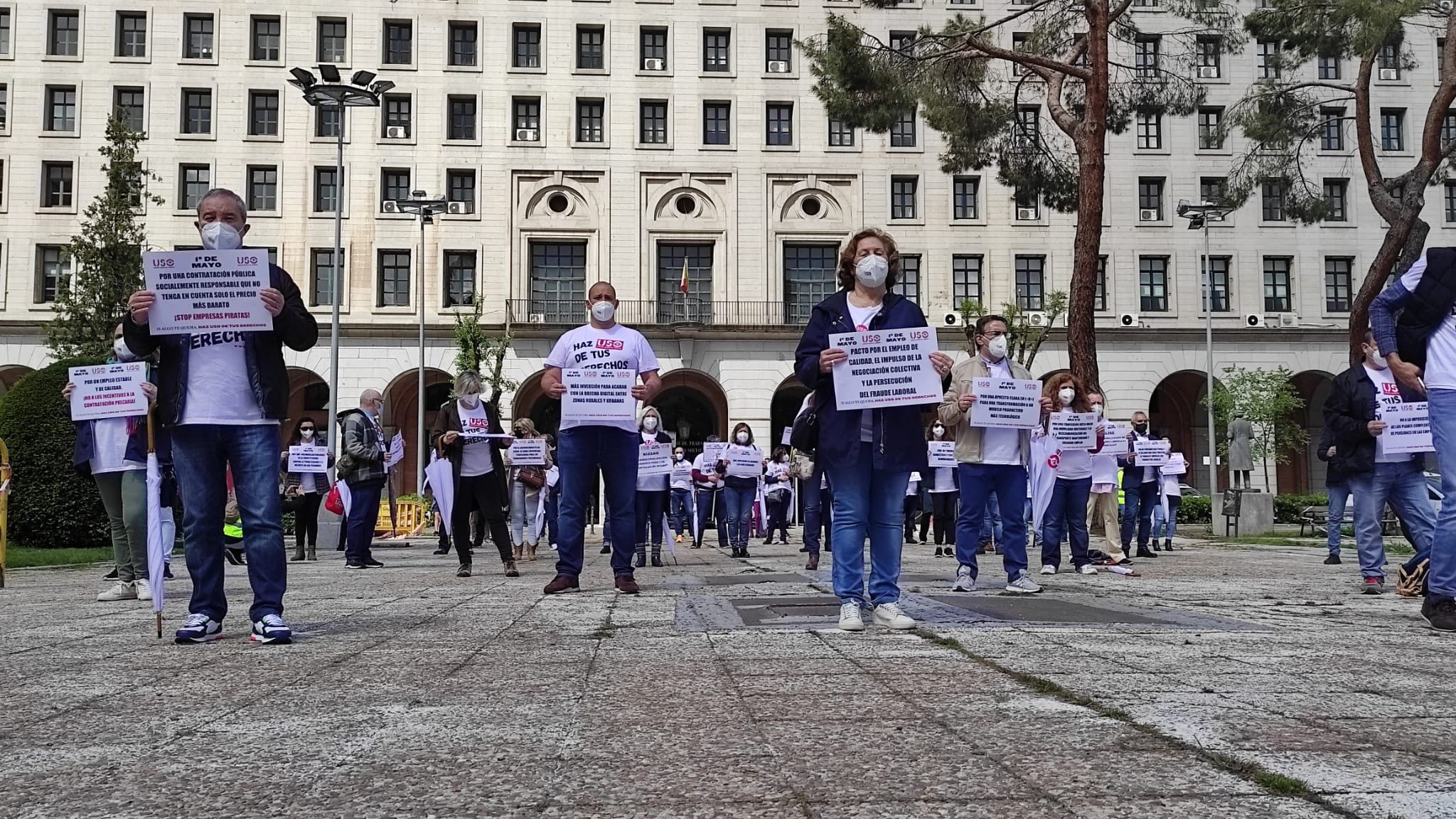 El secretario general de USO, Joaquín Pérez, ha participado en la concentración convocada en Madrid, frente al Ministerio de Trabajo y Economía Social, que ha reunido a un reducido grupo de dirigentes y afiliados, para recordar a los fallecidos; a los trabajadores que han perdido su empleo; a los que están en las colas del hambre a diario; a los que aún siguen en ERTE, con la incertidumbre sobre su futuro cada vez más presente; y a los trabajadores pobres, a los que su trabajo no les da para vivir.